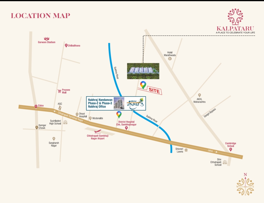 Nabhraj Kalpataru is located in Chikalthana, Aurangabad, one of the city’s most rapidly developing and sought-after residential areas. Known for its strategic connectivity, peaceful surroundings, and modern infrastructure, this location offers residents the perfect balance of urban convenience and serene living.